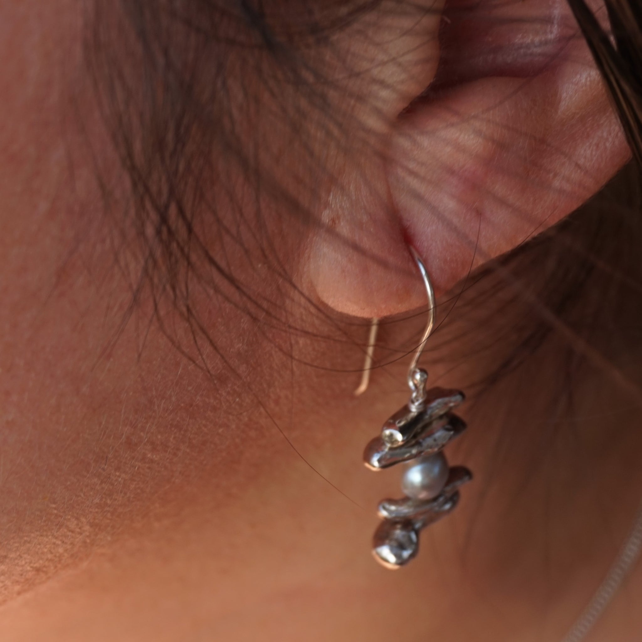 These earrings have a natural grey pearl threaded with four organically shaped sterling silver nuggets.