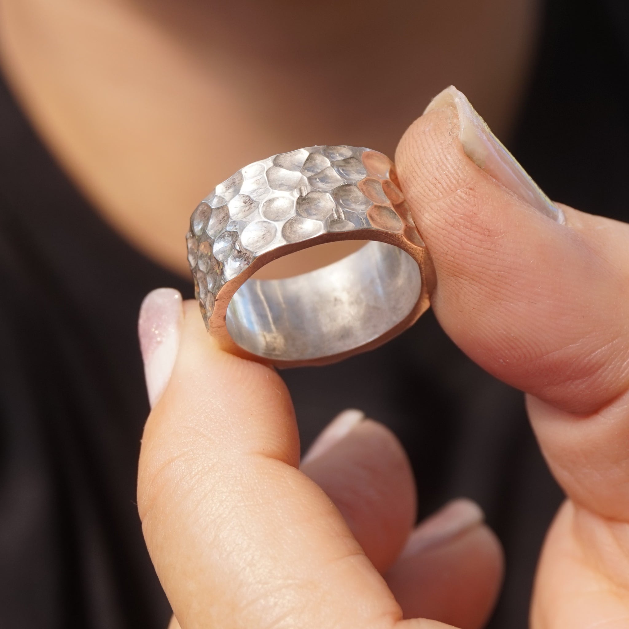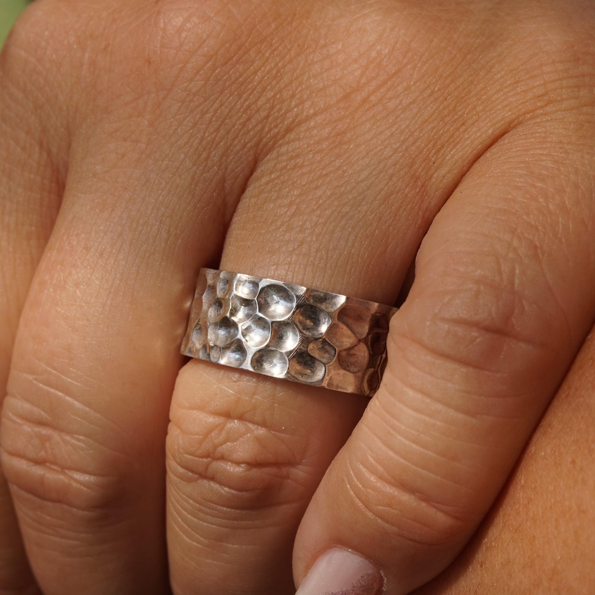 The Blake Ring is made of a thick, heavy band with hand-hammered indented texture.